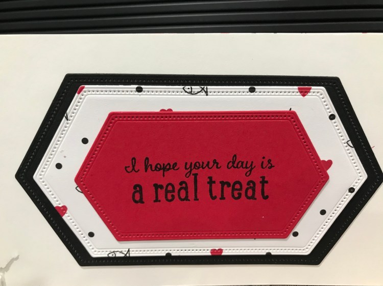 Stamp sentiment ‘Happy Birthday’ on scrap Real Red and die cut with Stitched Nested Labels Die measuring 2 ½ side to side and then stamp ‘I hope your day is a real treat’ on scrap Real Red and die cut with die measuring 3 ½ x 3 ½.