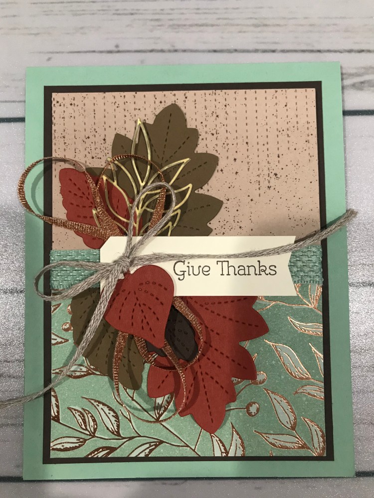 - Take your leaves and adhere them to the front of the card behind the ribbon using glue dots or your adhesive of choice. I also added some leaves from the Forever Gold Speciality Paper.