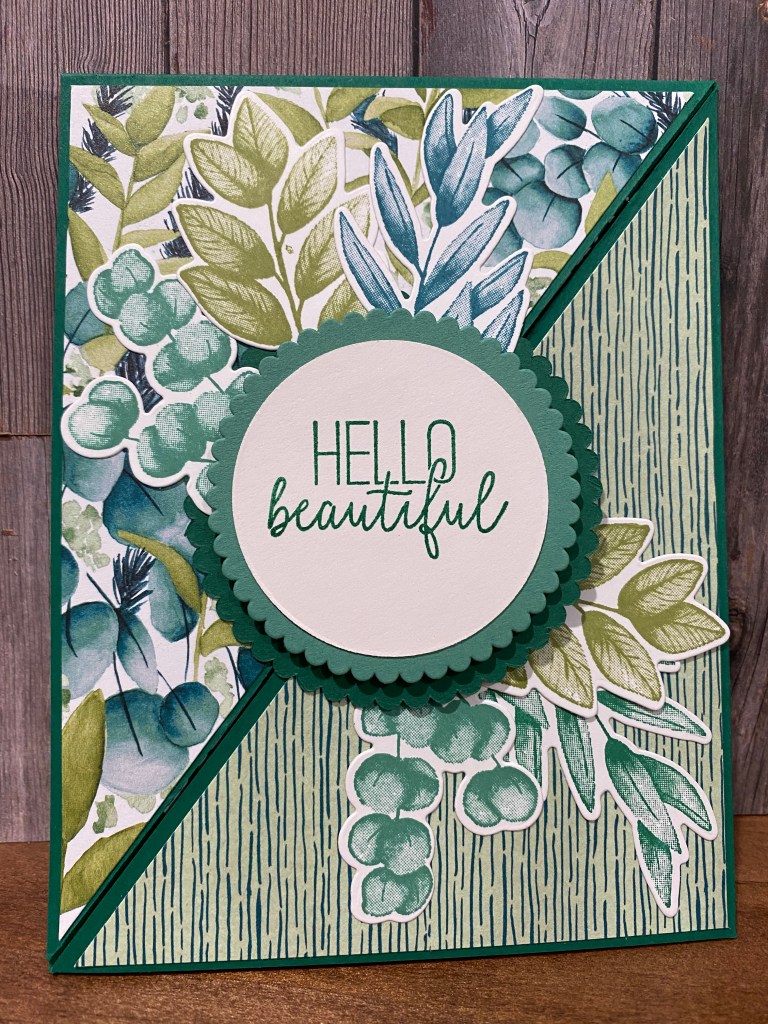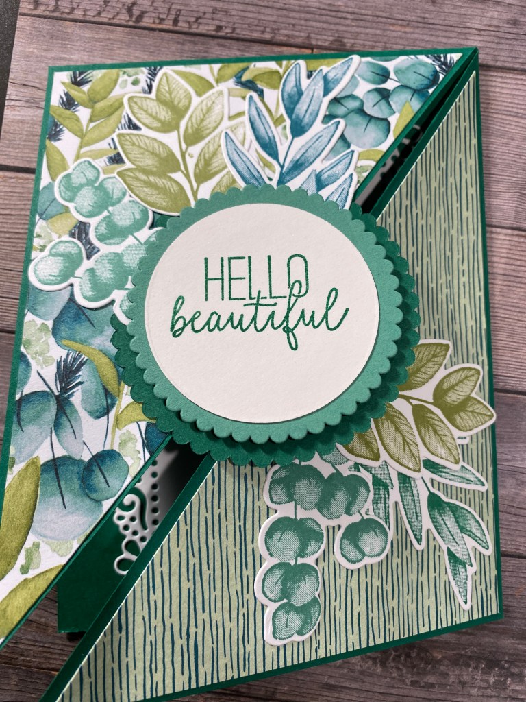 - Stamp the Shimmery White circle piece with Hello Beautiful from the Butterfly Gala Stamp Set and adhere to the Just Jade scallop circle and then adhere to the Shaded Spruce scallop circle using dimensionals. Adhere the die cut leaves to the scallop circle and also to the base of the card on the bottom right side(see picture)