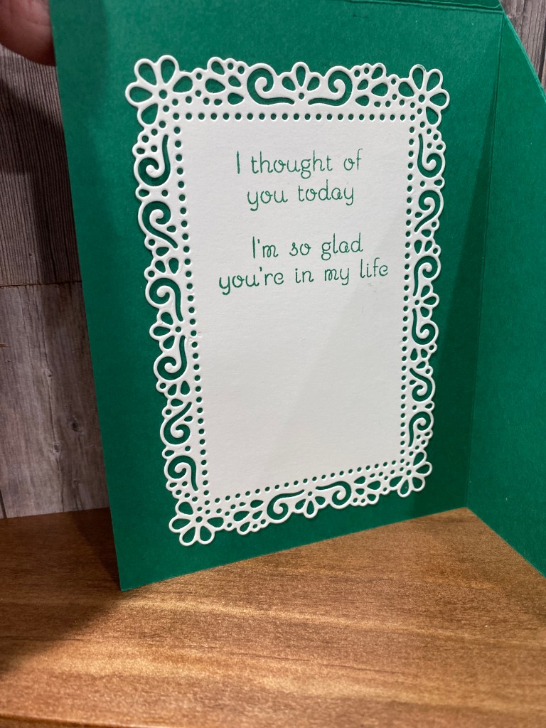 - Stamp sentiments from Love of Leaves on the Basic White Ornate Layer and adhere to the inside of the card.