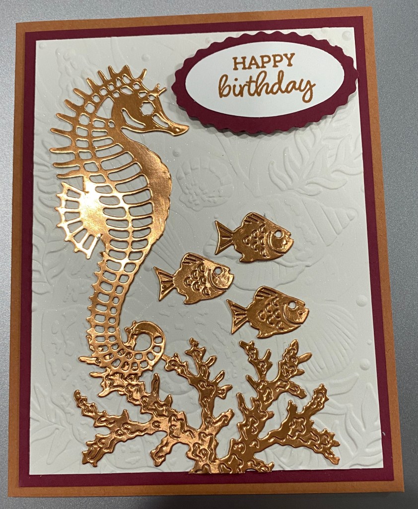 Have you seen the beautiful Sea Horse in the Sea Life die set? As soon as I saw him I pictured him in the copper foil! This card combines the Seashells 3D Embossing Folder and the Sea Life Dies  from the annual catalog. This is an easy card card to create and looks stunning!
