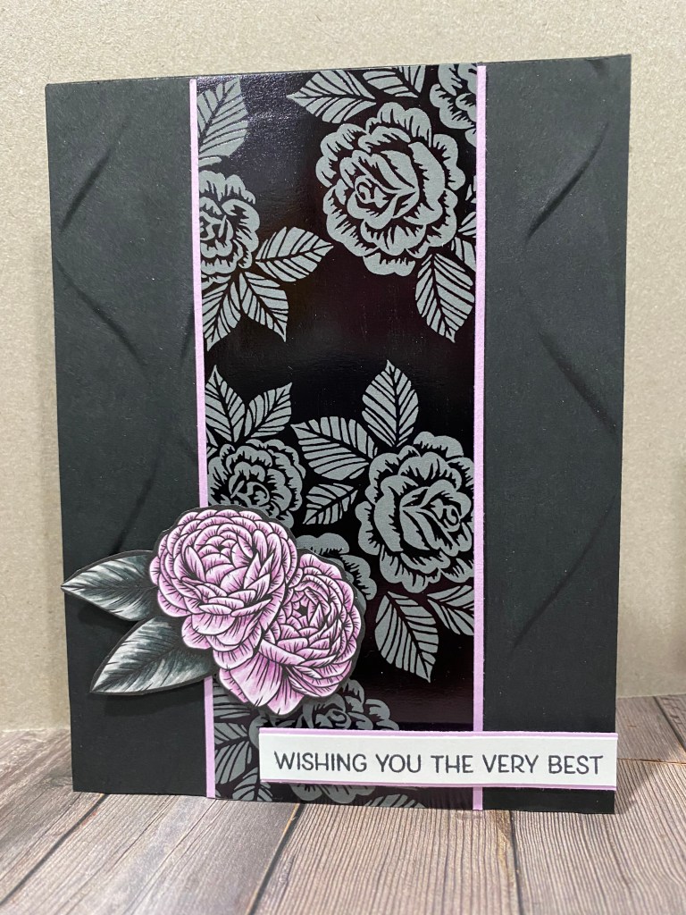 - Emboss the 5 1/2 x 4 1/4 Basic Black Card Stock using the Cascading Ruffles 3D Embossing Folder and then adhere to the Basic Black Card Base