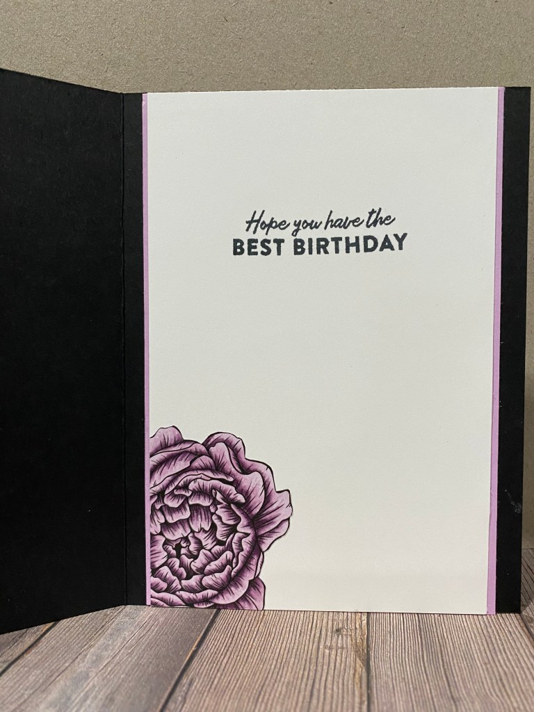 - Stamp inside sentiment on the Basic White 3 5/8 x 5 1/2 and adhere to other fussy cut Favored Flower to the edge of the card stock then adhere to Fresh Freesia 3 3/4 x 5 1/2 and center on the inside of the card.