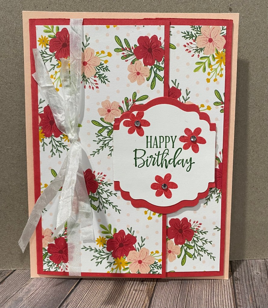 This card was created with one of my favorite Designer Series Papers – The Tea Boutique. The card was inspired by many Stampin’ UP! demonstrators using a variation of the gate fold card. The components of the card are below.
