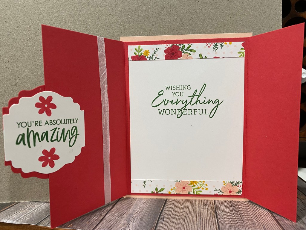 Stamp the inside of the card with Wishing you Everything Wonderful from Charming Sentiments and then add the Tea Boutique DSP ½ x 3 ¾ to the top and bottom and then adhere to the inside of the card.