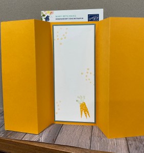 I really like this fun fold card card and I received a card using the Thanks a Bunch Sale-a-bration stamp set and just had to recreate it. I hope you like it as much as I did! With this card I used our Masking Paper to create the bunch of carrots.