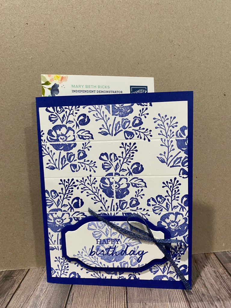 Using the Scoring tool score one of the 4×5 pieces. On the 4 inch side score at 1, 2 and 3 inches. On the 5 inch side score at 1, 2, 3, and 4 inches. Using the smaller of the 2 flower stamps from Shaded Summer, stamp in Starry Sky Ink in random pattern and then adhere to the card front.