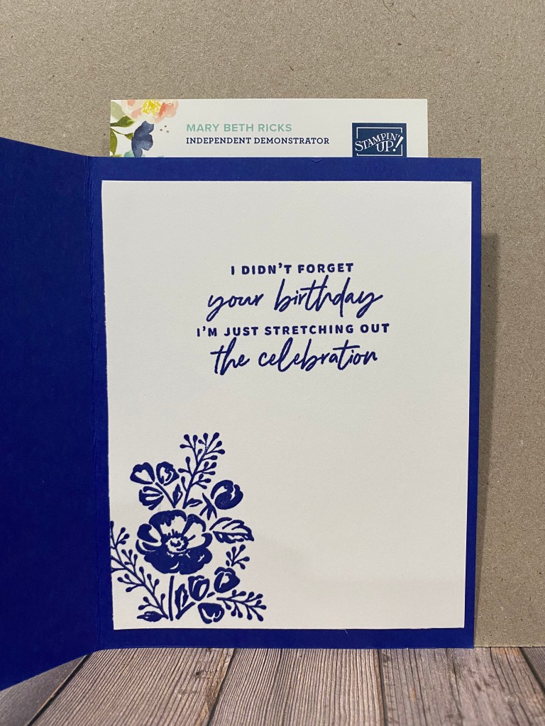 On the other 4×5 Basic White stamp the flower at the bottom left and then stamp the sentiment towards the top center and adhere to the inside of the card.
