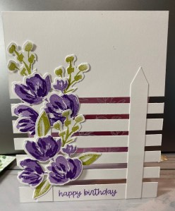 Here is my version of the card – which is very similar to many on social media. To create this card I used the Art Gallery Stamp Set and Floral Gallery Dies, with Stampin’ UP! Ink pads – Gorgeous Grape, Highland Heather and Pear Pizzazz.