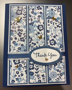 Stamp inside sentiment on 1 piece of Basic White Cardstock 5 1/4 x 3 5/8 and adhere the 1/2 x 3 5/8 DSP to the bottom of the cardstock add a Brushed Brass Butterfly beside the sentiment.