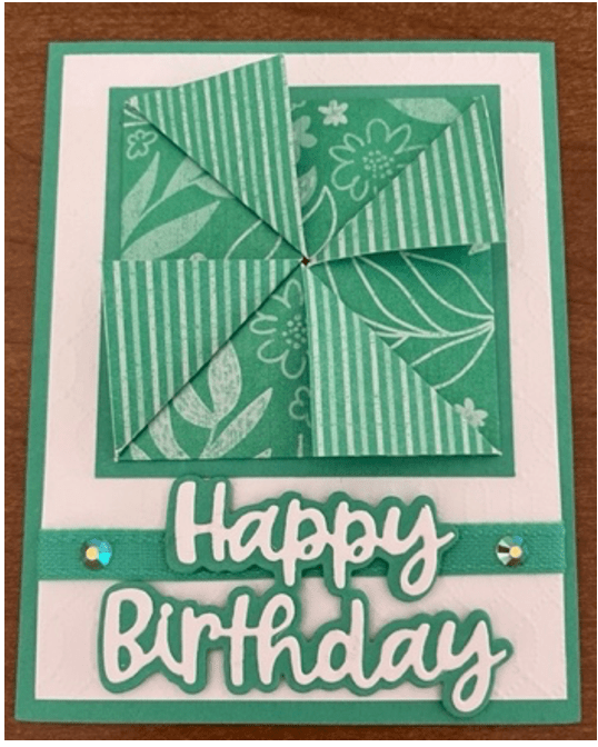 - Attach the pinwheel to the card front toward the top about 3/8 of an inch from the back layer. Center from side to side.