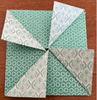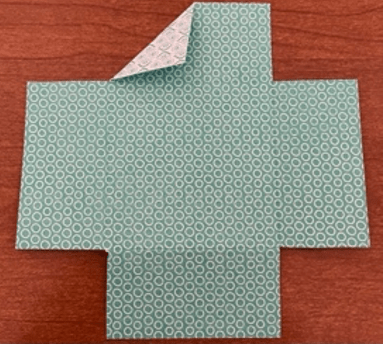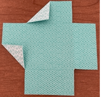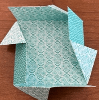 - On each side, take the left-corner and fold to the score line and crease. Go around and do the same on each flap. This will create a pinwheel. To close, you will fold them all down and tuck the last one under like you might do on a box.