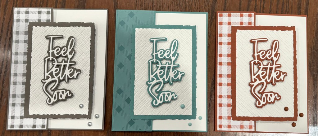 6. Adhere the detailed Basic White ‘ Feel Better Soon’ to the outline in the color you die cut then adhere to the embossed White Deckled Rectangle and then adhere to the Deckled Rectangle color cardstock and finally centering this piece adhere the left hand side to the front of the card on the Tartan Foil