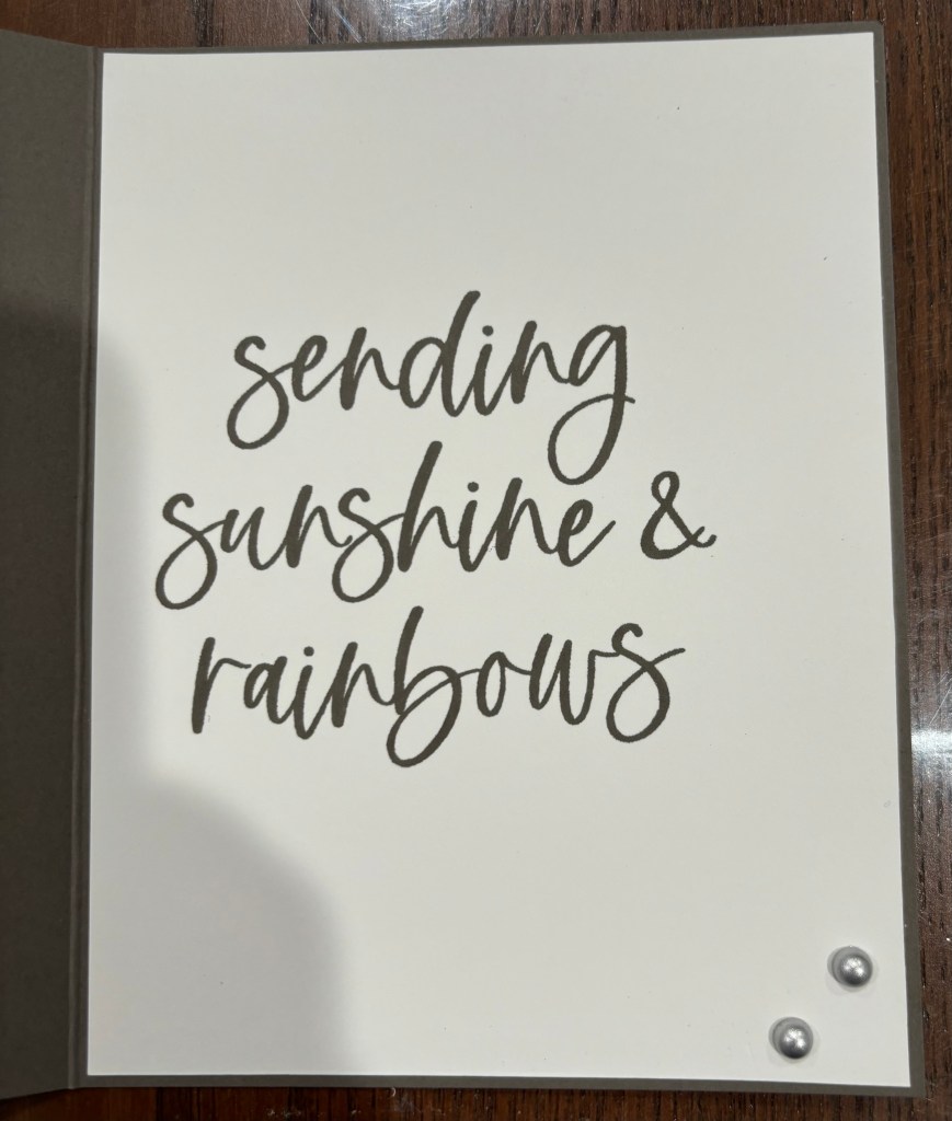 7. Stamp the 5 3/8 x 4 1/8 with ‘Sending Sunshine & Rainbows’ sentiment from Kindest Expressions closer to the left side and adhere to the inside of the card