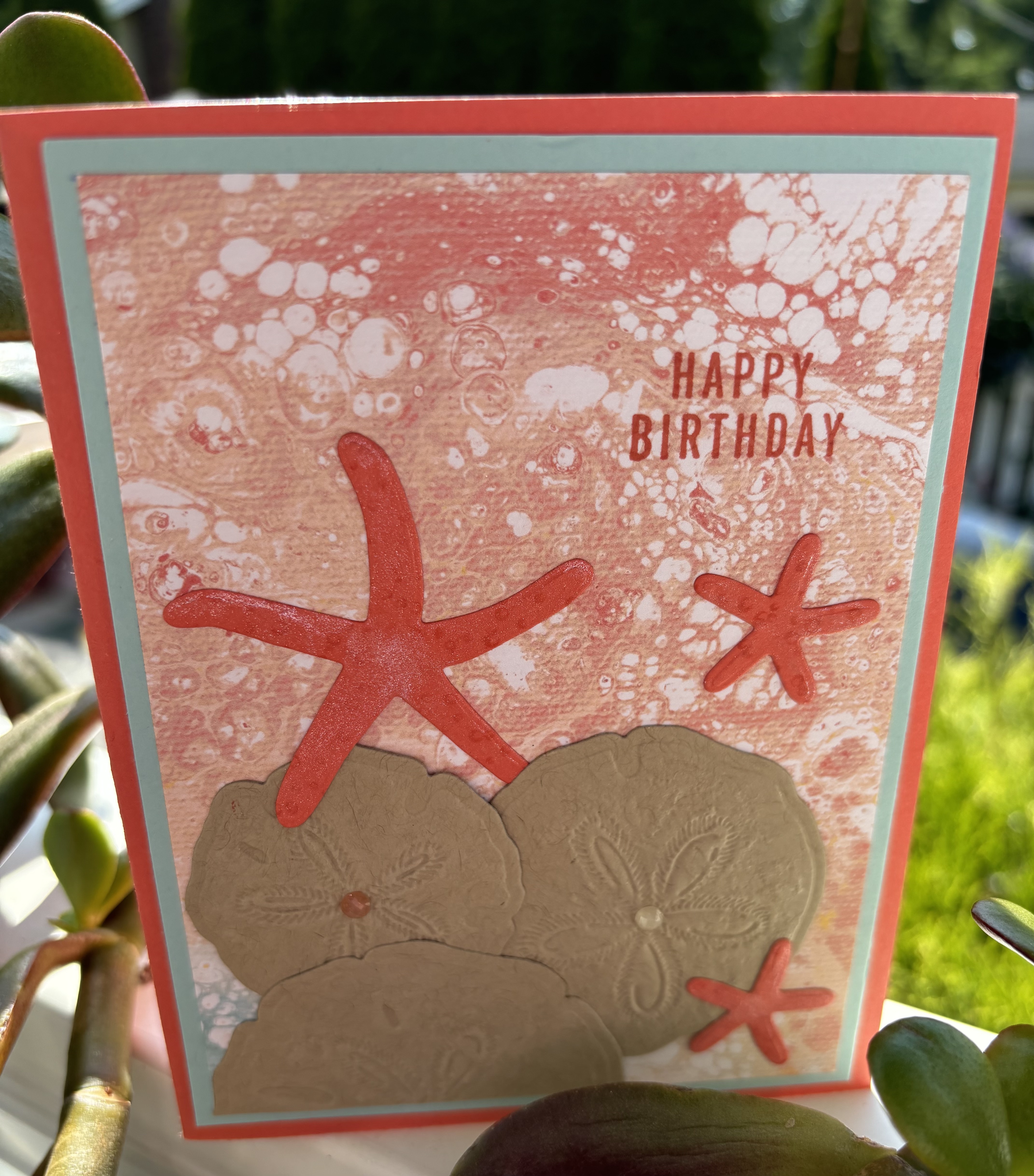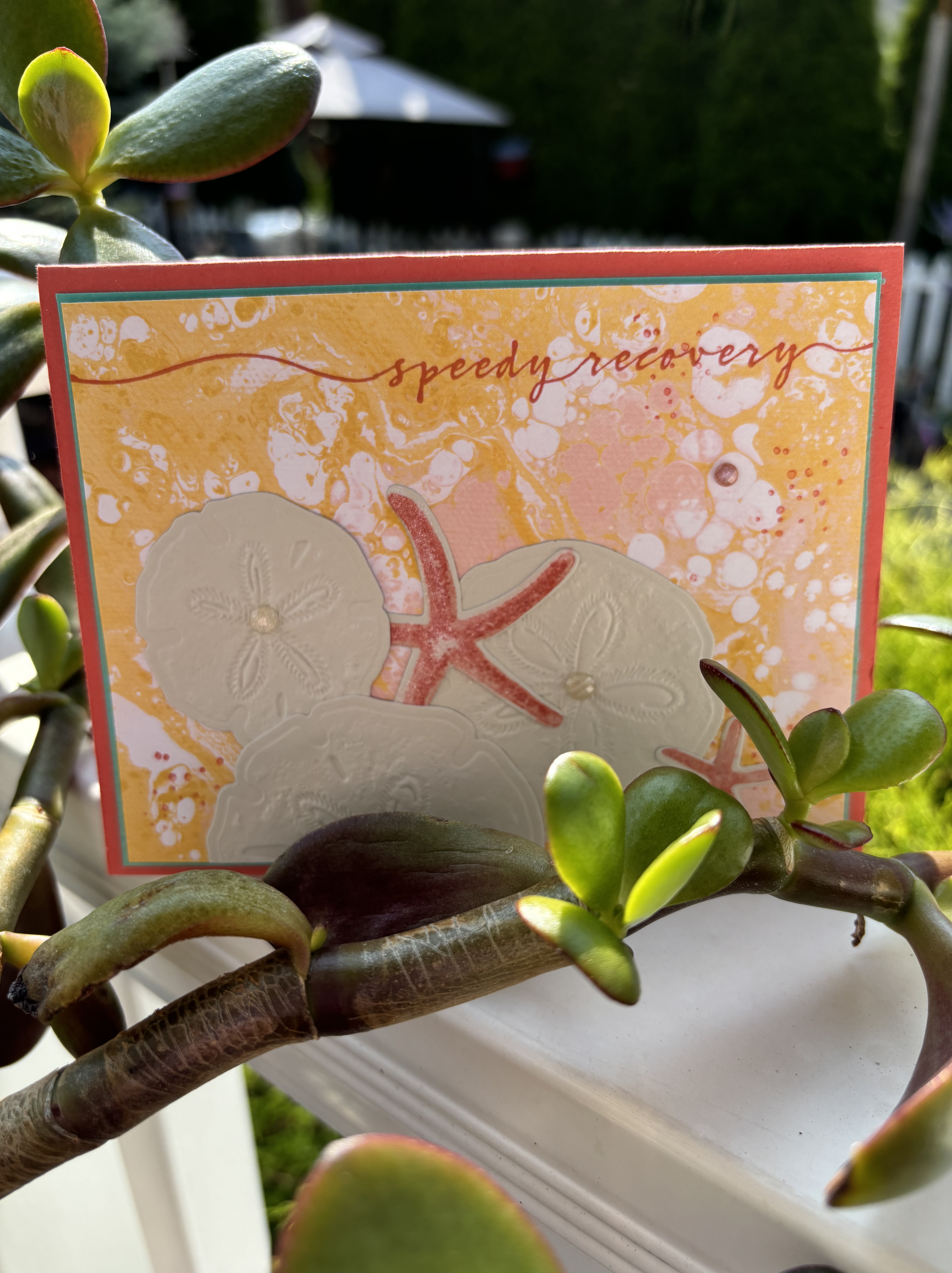 - Stamp inside sentiment and add the other half of the sand dollar to the inside left of the card.