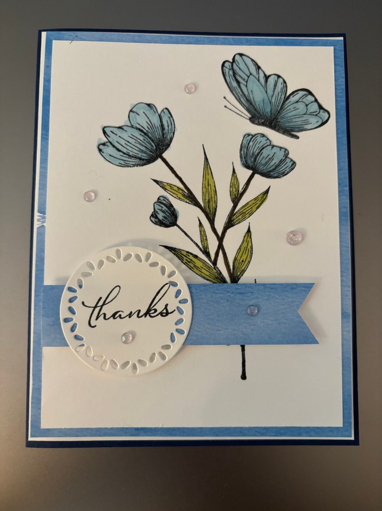 - Stamp flower and butterfly from Spotlight on Nature onto the Basic White 5 x 3 ¾. Color with Blends or Pencils and adhere to the Bright & Beautiful Paper