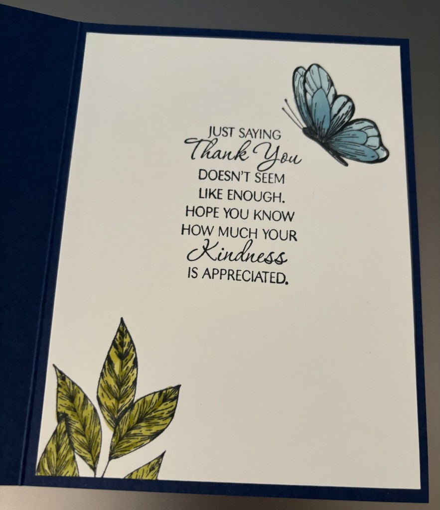 - Stamp sentiment from Hope You Know onto the Basic White 5 ¼ x 4 then stamp butterfly and leaves from Spotlight on Nature, color with blends or pencils and adhere to the inside of the card.