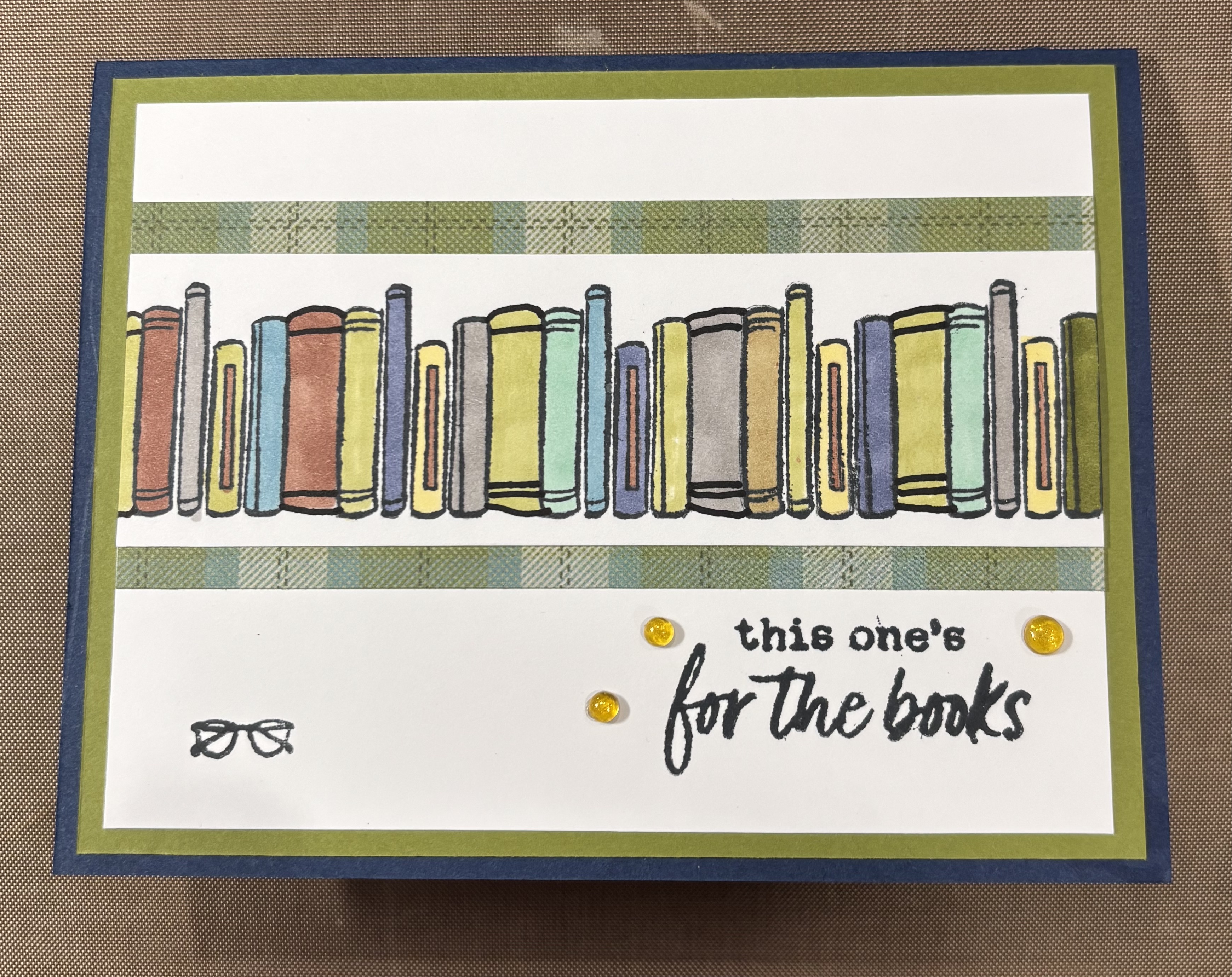 Stamp ‘This one’s for the books’ at the bottom right corner of the 5 x 3 3/4 Basic White and stamp the glasses on the bottom left corner.