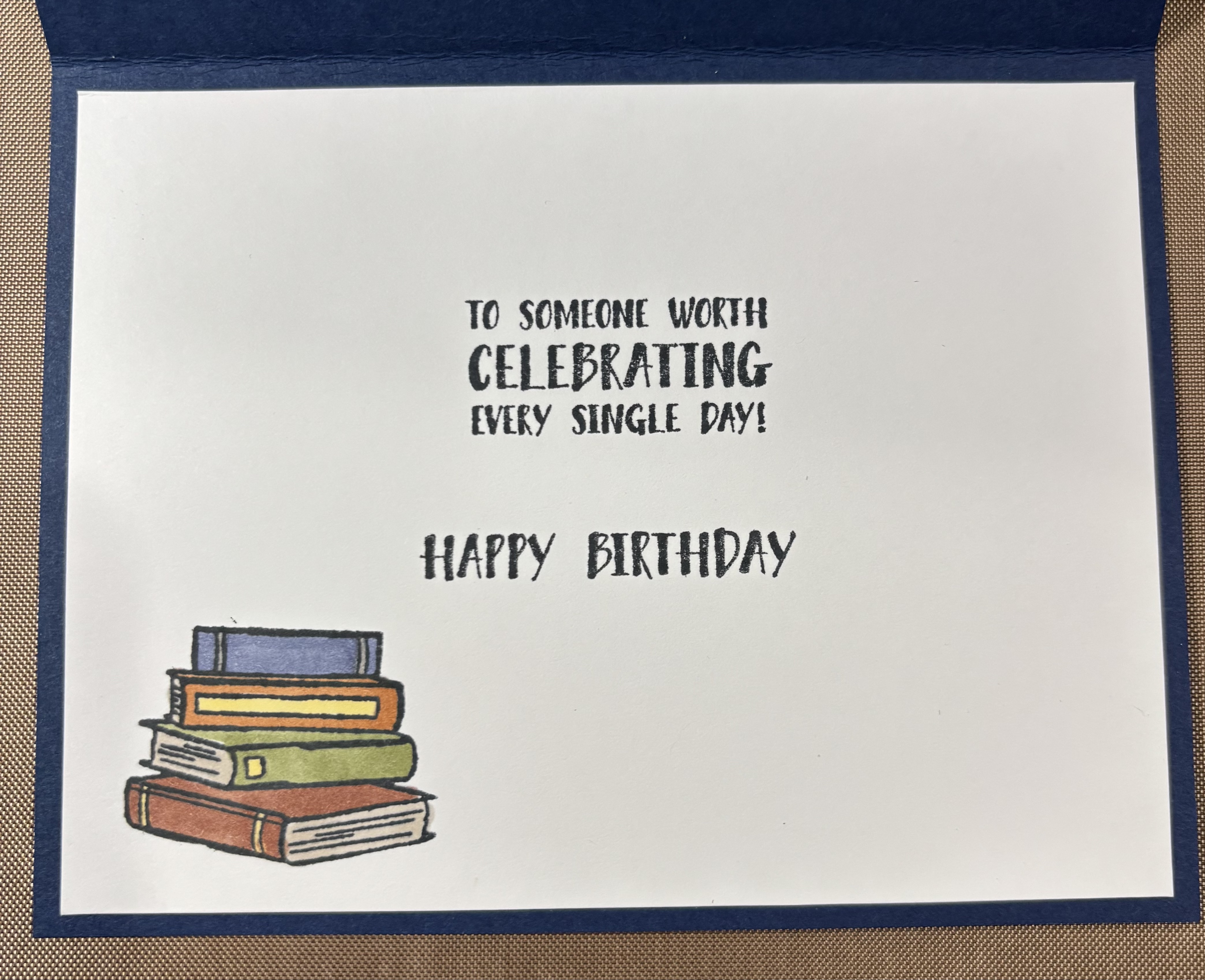 Stamp the books onto the 5 1/4 x 4 Basic White, then stamp the books onto the left and color with blends.