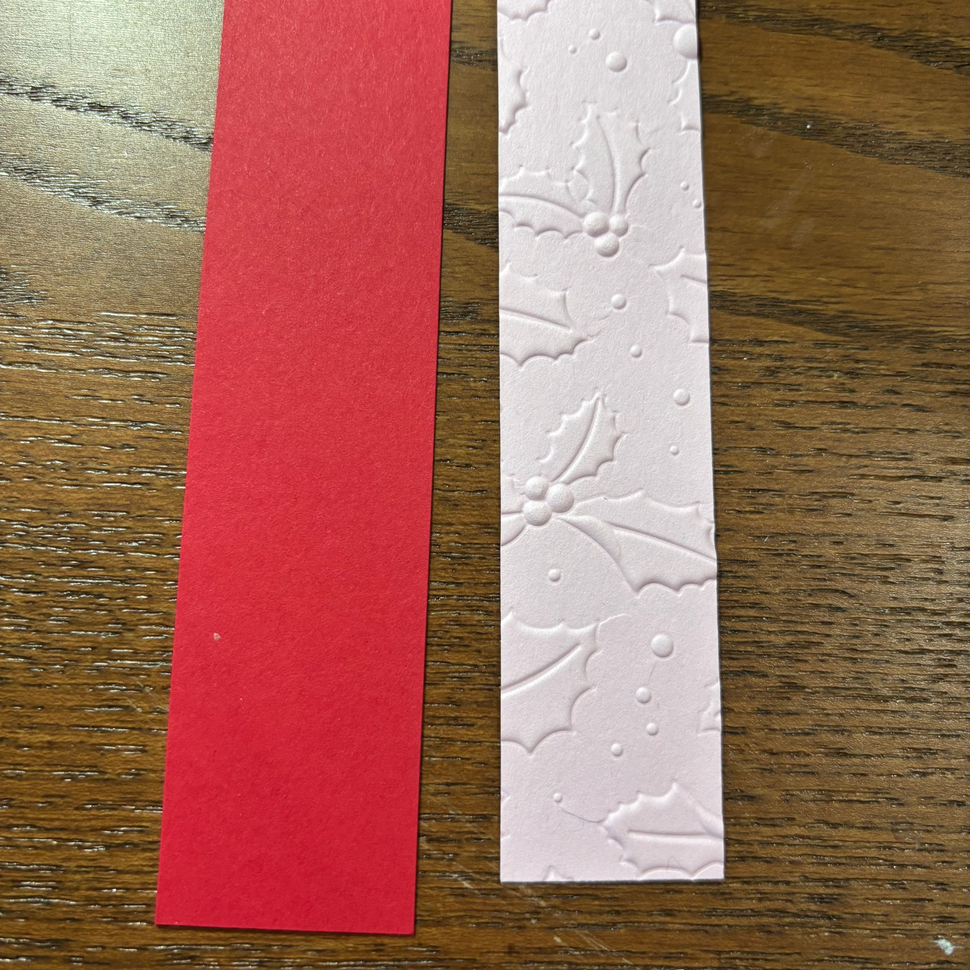 - Emboss the Bubble Bath Cardstock using the Jolly Holly Hybrid Embossing Folder and then adhere to the Real Red 1 1/8 x 4 5/8