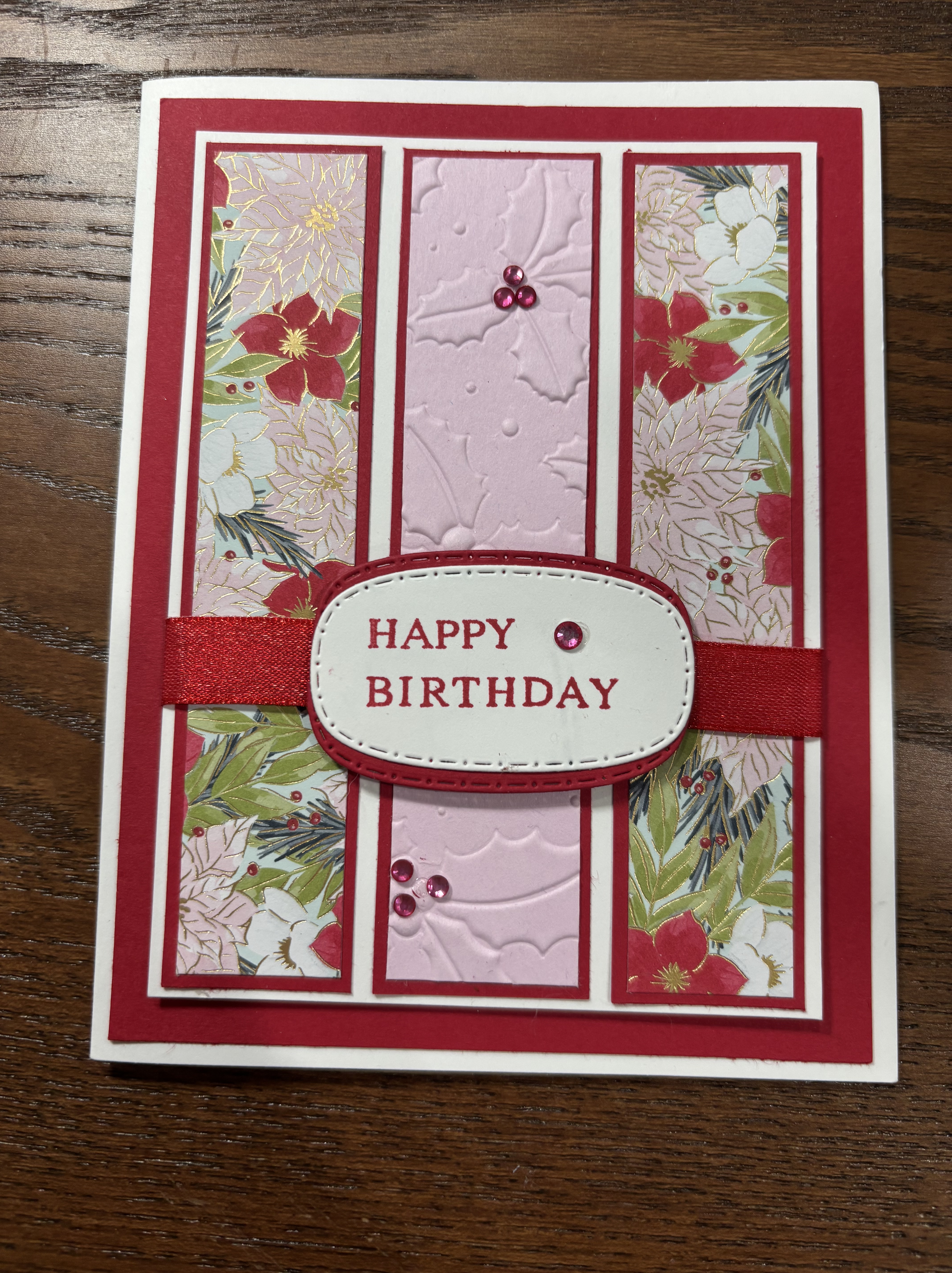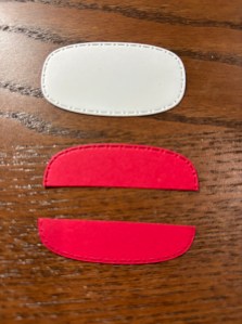 2. Die cut the Real Red 1 ½ x 2 ½ using the same die as above. Cut it in half lengthwise and adhere to the top and bottom of the stamped Basic White stamped oval.