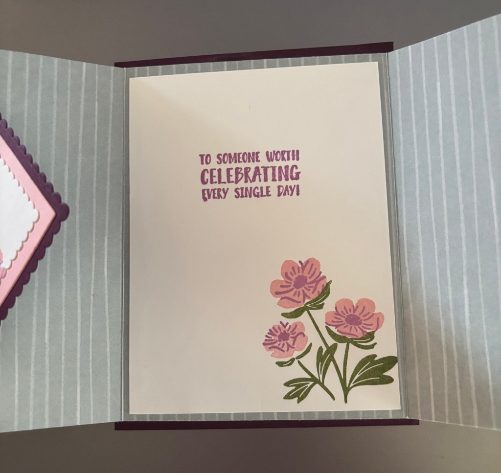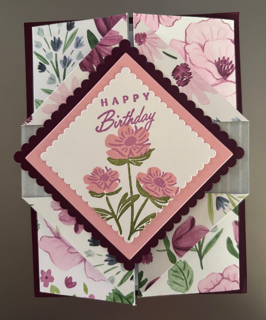This card is called a Diamond Gatefold card. It is easily recreated with the Designer Series Paper of your choice and any sentiment and focal stamps you have. Listed below are the items I used to create this card.